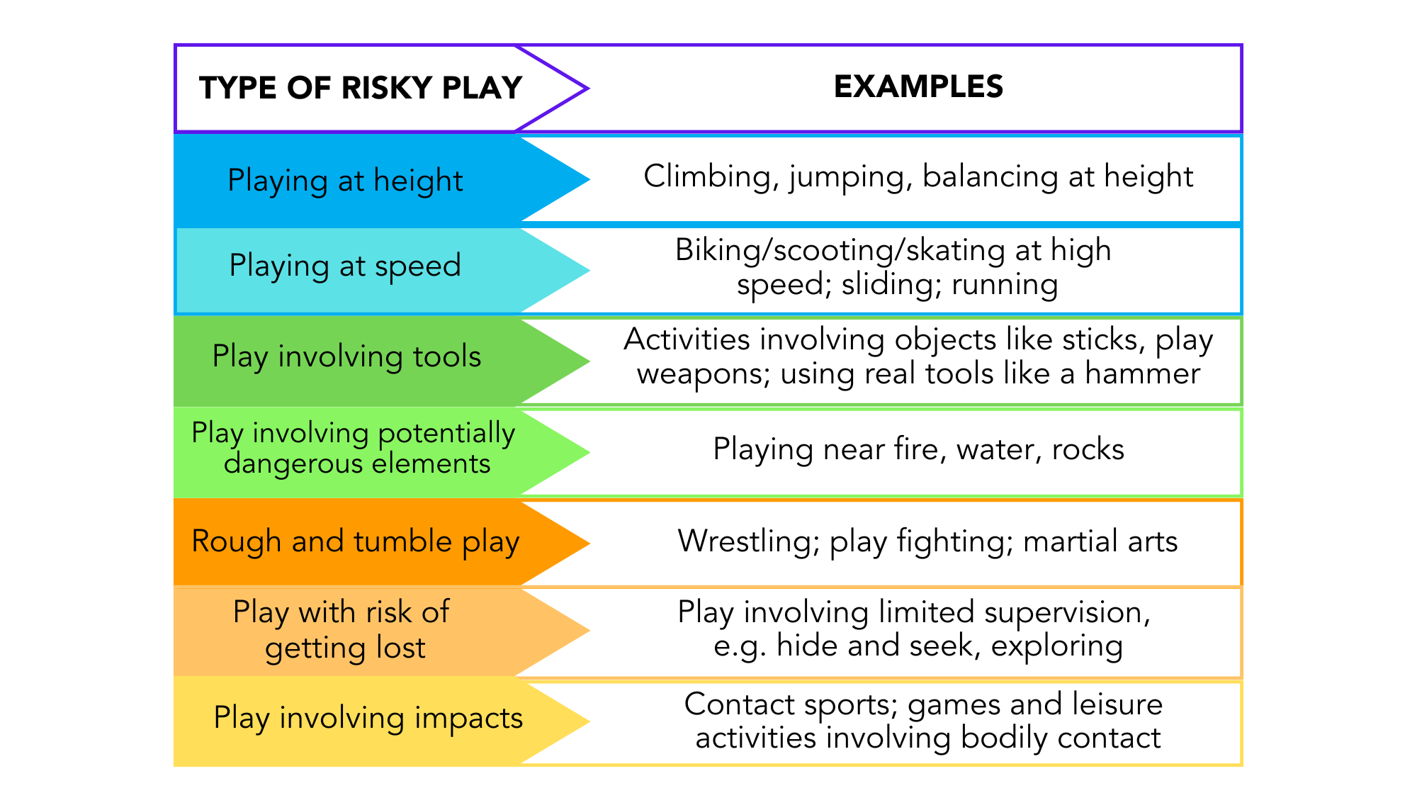 Risky play is characterized by thrilling and exciting forms of free play that involve inherent risks, such as the potential for physical injury, due to the uncertain nature of the activity. Figure 1 highlights the types of risky play and some examples of each (2).